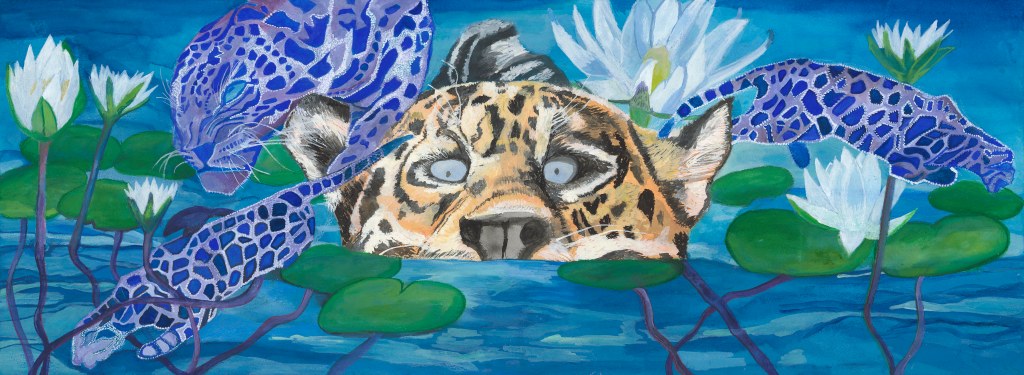 This jaguar is enjoying swimming in the river and shows the versatility of this cat to move and inhabit both land and water environments. The incorporation of lilies draws from Mayan iconography and refers to a transforming form that is fluid and representative of fertility. The inclusion of Lilies within Mayan Iconography may be indicative of practices that occurred with this plant to reach or attain the form of Jaguars and communicate with ancestors.